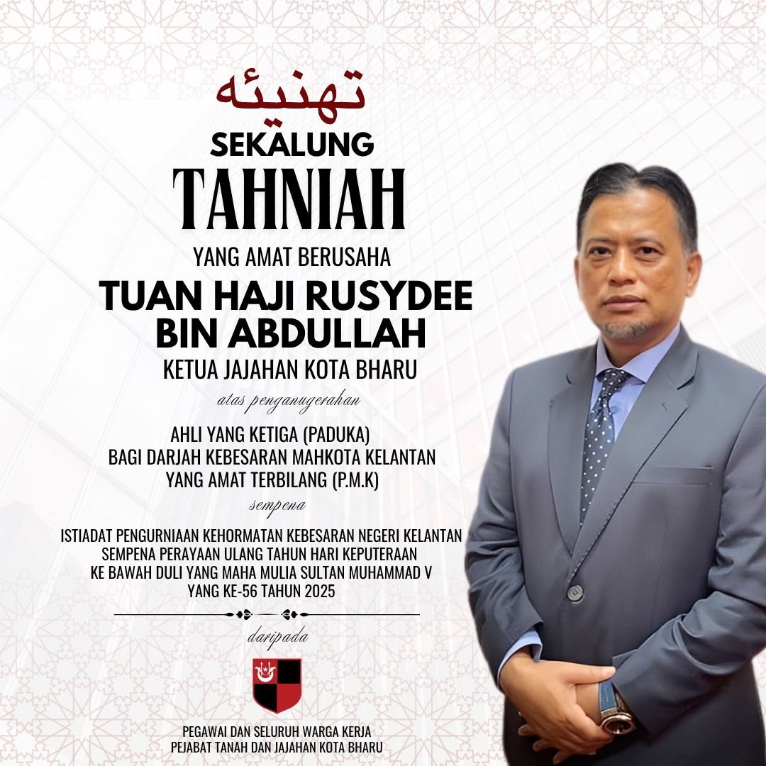 PEJABAT TANAH DAN JAJAHAN KOTA BHARU MERAKAMKAN UCAPAN SETINGGI-TINGGI TAHNIAH KEPADA ππππ ππππ ππππππππ ππππ ππππ πππππππ πππ ππππππππ, πππππ πππππππ ππππ πππππ ATAS PENGANUGERAHAN ππππ ππππ ππππππ (ππππππ) ππππ ππππππ πππππππππ πππππππ ππππππππ ππππ ππππ πππππππππ (π.π.π) BERSEMPENA PERAYAAN ULANG TAHUN HARI KEPUTERAAN KEBAWAH DULI YANG MAHA MULIA SULTAN MUHAMMAD V YANG KE-56, TAHUN 2025.